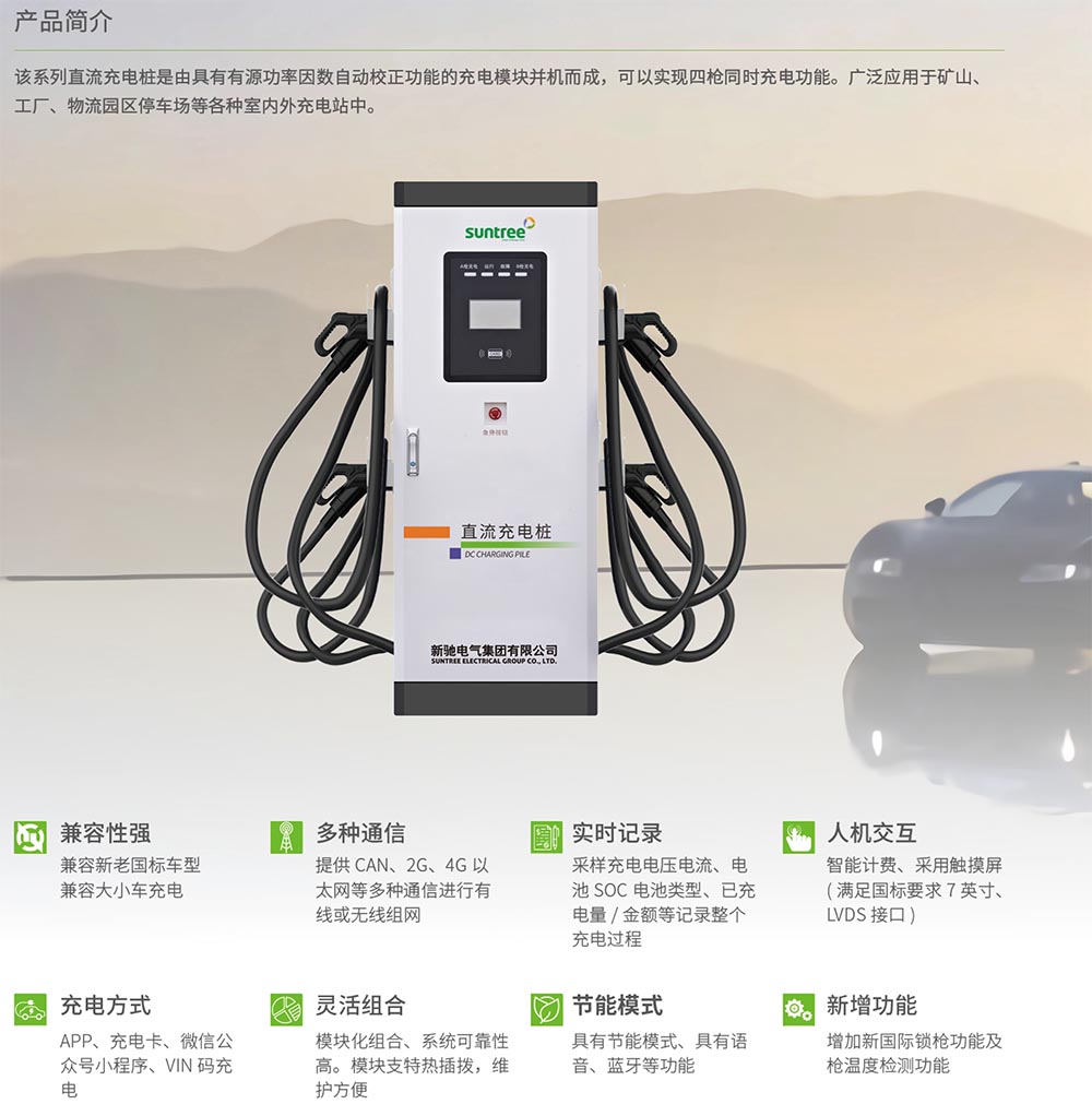 该系列直流充电桩是由具有有源功率因数自动校正功能的充电模块并机而成,可以实现四枪同时充电功能。广泛应用于矿山、工厂、物流园区停车场等各种室内外充电站中。